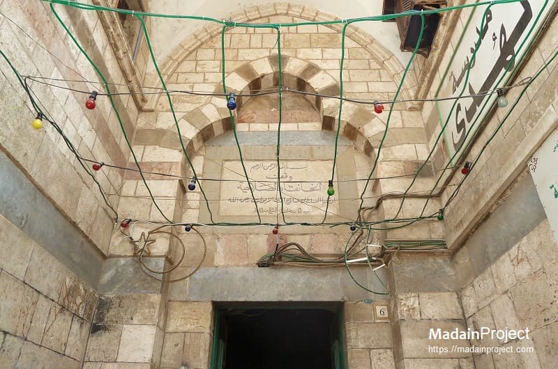The principal architectural components are arranged around a sequence of internal spaces accessed from a pronounced entrance on al‑Khanqah al‑Salahiyya Street. The entrance portal is composed in the ablaq technique (inspect), employing alternating courses of light and dark stone—an aesthetic and structural trait typical of Ayyubid and Mamluk Jerusalem architecture—facilitating the transition from the dense urban exterior to the interior complex.