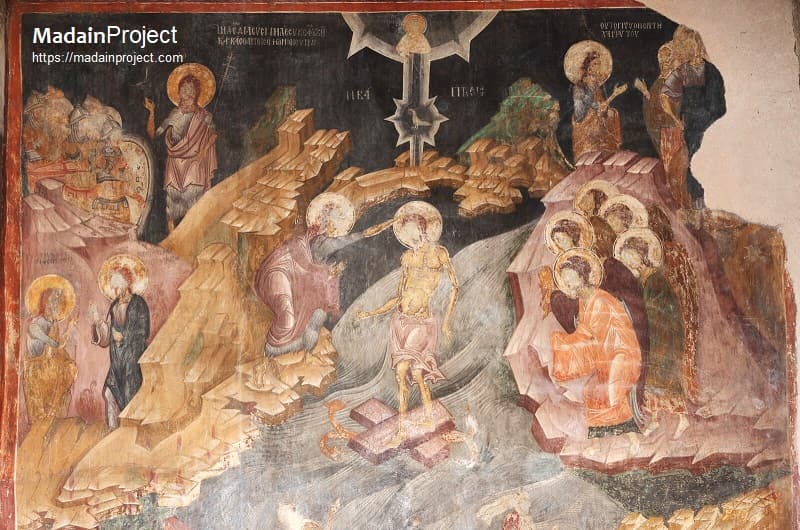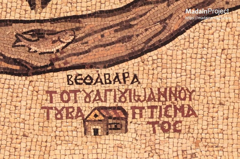 The sixth-century Madaba Mosaic Map is widely regarded as preserving a visual reference to the Christian tradition of the baptism of Jesus that is plausibly associated with al-Maghtas, though the identification cannot be considered definitive. On the map, a baptismal site is labeled in Greek as ΒΕΘΑΒΑΡΑ (Bethabara) and placed near the Jordan River opposite Jericho. This name is attested in early Christian literature as an alternative designation for Bethany beyond the Jordan, a variation already discussed by Origen in the third century CE, who sought to reconcile divergent manuscript traditions of the Gospel of John.