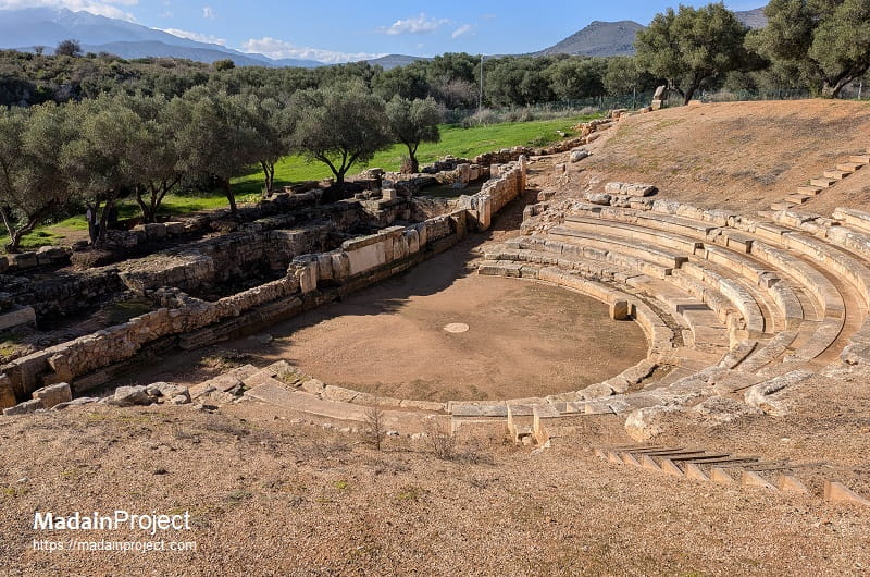 The theater represents a significant archaeological exempla of the Hellenistic to Roman architectural transition. Constructed primarily from local fossiliferous limestone within a natural southern-facing declivity, the structure’s development occurred in three distinct chronological phases: the Hellenistic (3rd century BCE), First Roman (1st century CE), and Second Roman (3rd century CE). Its layout consists of a semi-circular auditorium (koilon or cavea) spanning 54.68 metres in diameter, which historically accommodated 26 rows of seats divided into four wedge-shaped sections (cunei) by five staircases. Notably, its orchestra is among the smallest of its kind, featuring a radius of only 5.45 metres and containing the remains of a thymele (altar) dedicated to Dionysus. Despite suffering extensive degradation in the 20th century CE due to the operation of a modern lime kiln that calcined much of its seating, systematic excavation and restoration projects conducted by the Ephorate of Antiquities of Chania between 2008 and 2015 CE have successfully stabilised the monument for contemporary cultural use.