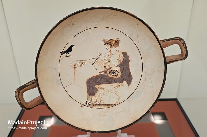 The interior of the vessel portrays Apollo seated on a chair with legs terminating in lion-paw forms. He is depicted with an elaborate hairstyle and crowned with a laurel wreath. The god is dressed in a white chiton, a red himation, and sandals. In his left hand, secured by a red strap, he holds a seven-stringed lyre, while with his right hand he pours a libation from a shallow patera adorned with relief decoration. Positioned opposite Apollo is a black bird, the interpretation of which remains debated: it has been identified either as an oracular bird or as a crow associated with the myth in which it informs Apollo of the impending marriage of his beloved Koronis, daughter of King Phlegyas.