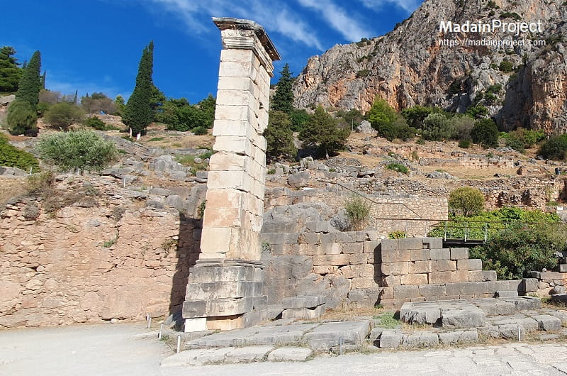 There are two treasuries among the non-religious structures in the precinct of Athena Pronaia. Treasuries were small buildings dedicated by the Greek city-states and their colonies at the sanctuaries. One of these treasuries is Doric and dates to the fifth century BCE. However, it is the second that is noteworthy, the so-called treasury of the Massalians, the Greek colonists of Massalia (modern day Marseilles) who came from Phocaea in Ionia. Masterfully built around 530 BCE in the Ionic order of gleaming Parian marble, it had two columns on its facade with Aeolic order capitals. In front of the two treasuries are preserved the foundations of the stelai on which were recorded confiscations and debts to the sanctuary, as well as the pedestal atop which the Delphic trophy for repulsing the Persians in 480 BCE was mounted.