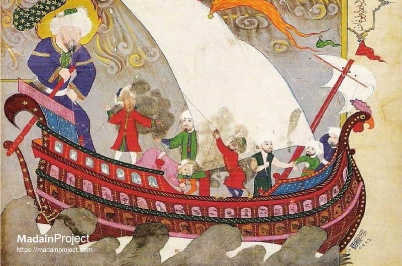 A Mughal miniature painting from the Stories of the Prophets. Nuh (Noah) seated in the upper right corner, while the animals are gathered in the middle and lower decks, the men are seen tending to the ship and rescuing.