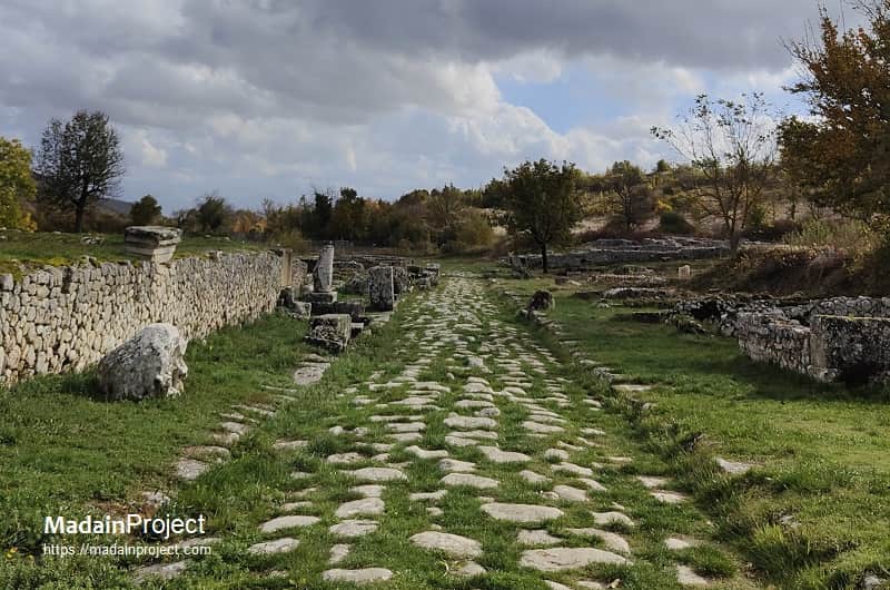A large number of notable archaeological structures remain along the Petra decumanus, including, a nymphaeum, the great temple, temenos, and a Hadrianic gate or triumphal arch.