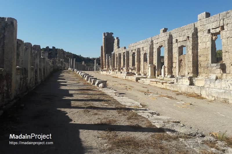 The Western Colonnaded Street of Perga, one of the city's two main arteries, is a roughly 460-meter-long, 8-meter-wide thoroughfare that runs from the main street intersection toward the Palaestra and Northern Baths. Lined with Corinthian or Ionic columns, these porticoes provided pedestrians with shaded walkways and served as a location for shops. Archaeologists conducting excavations along this route have revealed evidence of seismic damage and subsequent repairs, as well as the floors of the shops, including a notable mosaic depicting Agamemnon's sacrifice of Iphigenia. The opening of this street as a tourist route has provided visitors with a clear path toward other northern landmarks, such as the Northern Baths, completing a key section of the ancient city's urban plan.