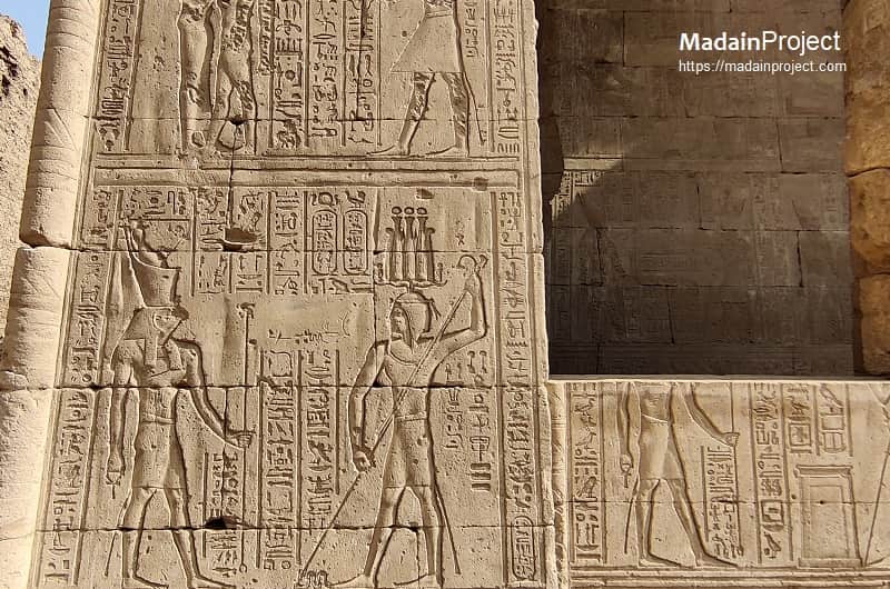 The reliefs that cover the walls of the Edfu mammisi present a tightly focused narrative: scenes of the divine birth, the attendance of birth-deities (notably Hathor and Khnum), ritual anointings, the presentation of the newborn god, and episodes where the king partakes in or legitimates the event. The iconography emphasises fertility, protection and royal endorsement; for example, Hathor appears in roles associated with mothering and music, Khnum with the fashioning of the child on his potter’s wheel, and Horus as the divine son whose generation secures the continuity of kingship. Where pigments survive or where sculptural modelling is clear, the reliefs show sequence and ritual detail that have been used by modern researchers to reconstruct liturgical practice.
