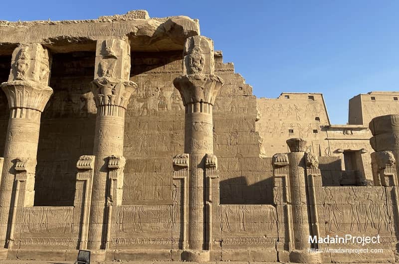 Scholarly publications and project records attribute the erection of the Edfu mammisi to the Ptolemaic rulers: building activity at the site is commonly linked to Ptolemy VIII (mid-second century BCE), with later decorative additions attributed to subsequent Ptolemaic kings such as Ptolemy IX. Inscriptions carved on the mammisi’s walls record royal participation in the cultic programme and date elements of the schemata with the kind of precision found elsewhere at Edfu, where the larger temple’s foundation and inauguration dates are recorded in the inscriptions. The mammisi must therefore be read as a late Ptolemaic monument, circa the second century BCE, embedded in a long local tradition of Horus worship.