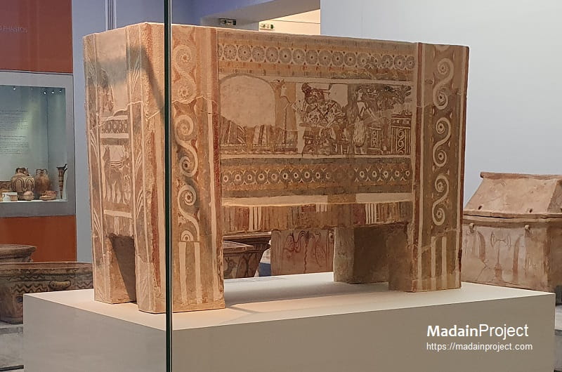 The entire monument reminds of much earlier funerary buildings of the Late Minoan Period, such as the one depicted on the famous AyiaTriada sarcophagus (inspect), now displayed in the Heraklion Museum.