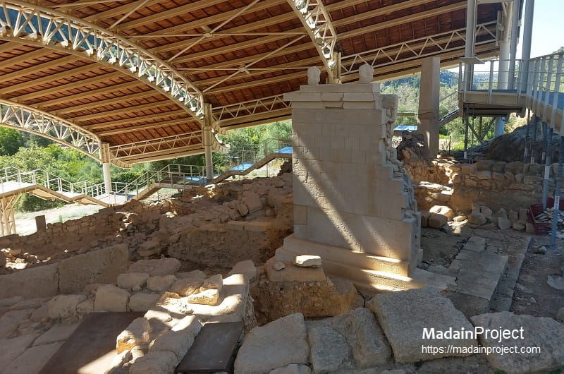 Funerary monument 4A, in the middle of the site, is a fairly large masonry structure with a relatively square floor-plan bounded by an enclosure wall on the north, west and south. The lower foundations of the monument, which consist of unworked stones, are fairly strong, and support euthynteria rest at least two limestone orthostates, above which rise stone walls. Based on a series of observations relating to the structure, on fragments of plain and relief architectural elements discovered during excavation, and on stone warriors carrying shields, which were discoveredon its euthynteria and in the surrounding areas, an attemplt was made to reconstruct the western and southern sides using new materials that imitate the ancient finds, in order to give visitors an idea of the overall structure as it may have stood during the antiquity. The west wall of the enclosure of the monument bears traces of funeral pyres on its outer facade, lit on the orthostates of the courtyard of crematorium A, which are dated to about the middle of the seventh century BCE (circa 650 BCE), and this date, therefore, appears to form the terminus ante quem for the monument.