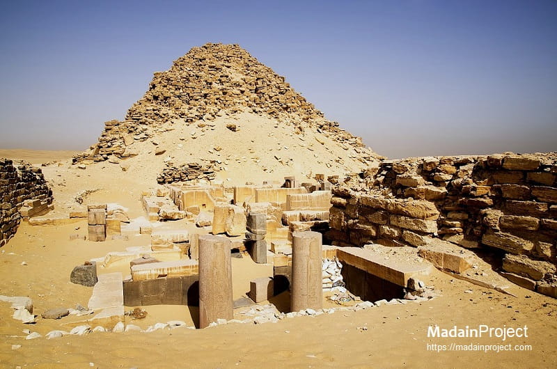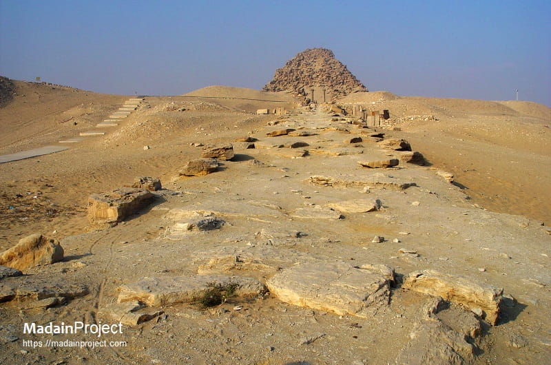 The complex is located on the desert plateau at Abusir, north of Saqqara necropolis and south of Giza. It reflects a transition in royal funerary architecture from the Fourth to the Fifth Dynasty, characterized by reduced pyramid scale and increased emphasis on elaborately decorated temple spaces, situating the complex within the Early Bronze Age of the ancient Near East. The core pyramid was constructed of local limestone blocks arranged in accretion layers, with a fine white limestone casing from Tura. The mortuary temple is especially notable for its extensive relief decoration depicting royal expeditions, tribute scenes, and ritual activities. The complex was connected to a valley temple (now largely destroyed) via a covered causeway aligned east–west, facilitating processional movement from the Nile floodplain to the pyramid plateau.