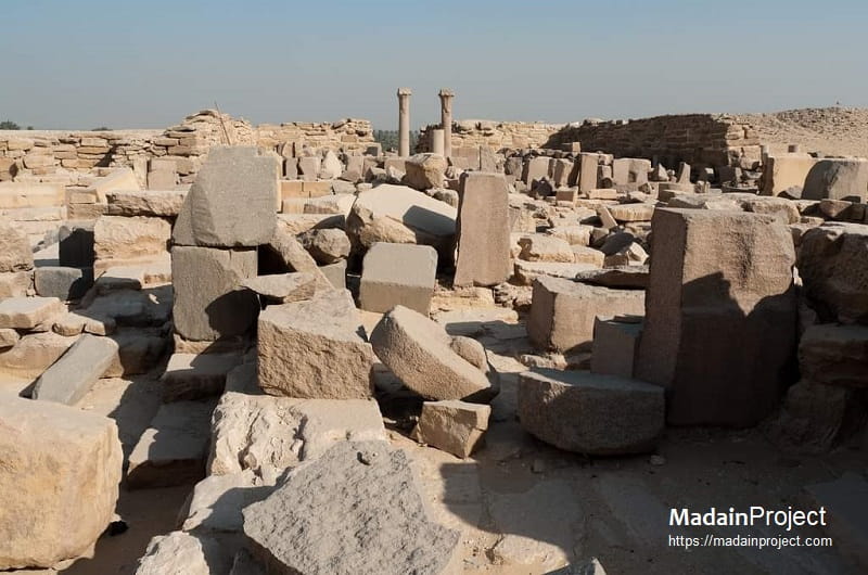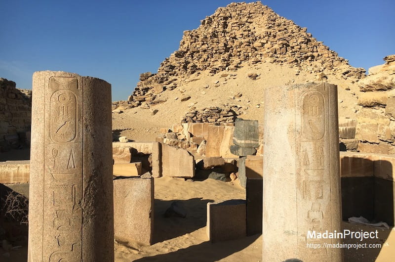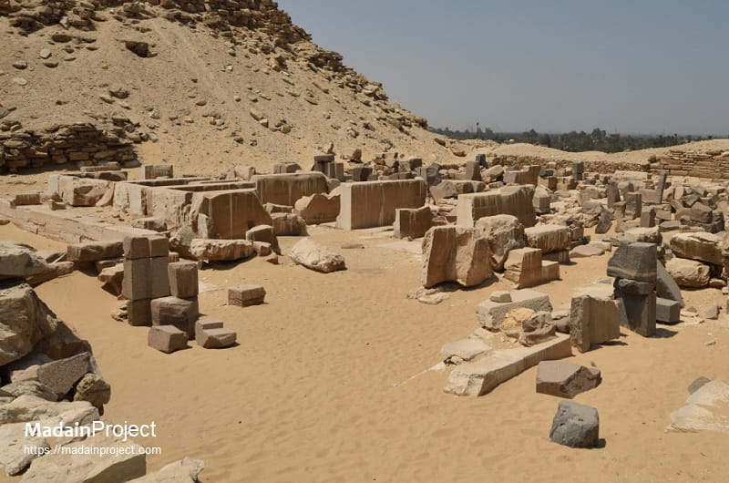 The entrance from the causeway led into a transverse hall supported by palmiform granite columns, followed by an open courtyard surrounded by colonnades. The courtyard featured a basalt-paved floor and was likely used for ritual purification and offering presentations. Beyond this space lay a series of offering halls, magazines, and a sanctuary area containing a false door and offering altar, which served as the focal point of the king’s mortuary cult.