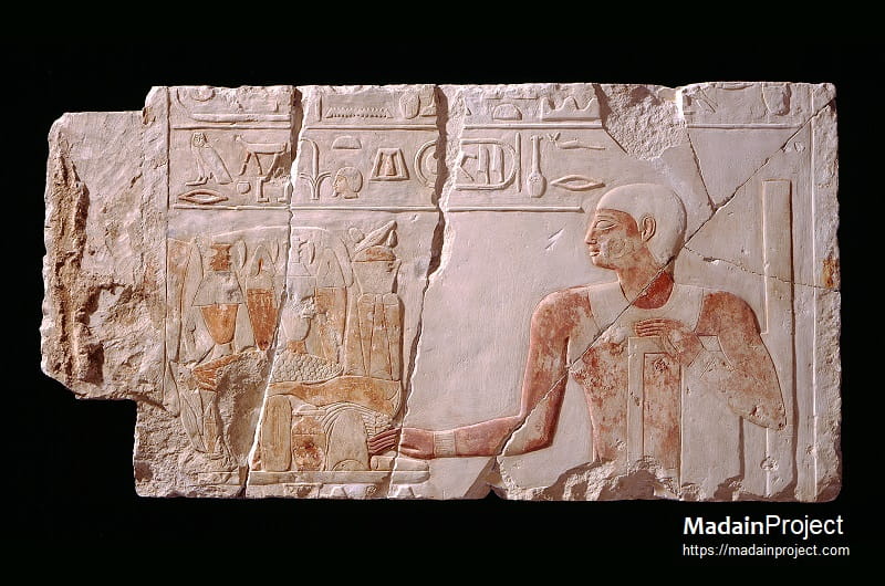 Another prominent scene occurs in Room E on the north wall, where Qar is depicted seated beside his mother, Khenout (ḫnwt). Both figures wear similar attire consisting of short wigs, broad collars, bracelets, and pleated skirts. They sit before a table laden with bread and offerings. Such scenes represent the traditional funerary motif of the offering table, symbolizing the sustenance desired by the deceased in the afterlife.