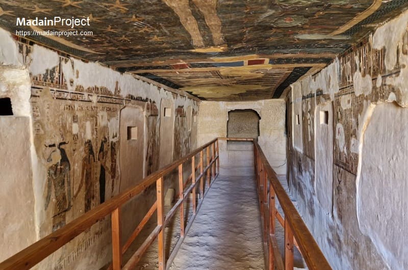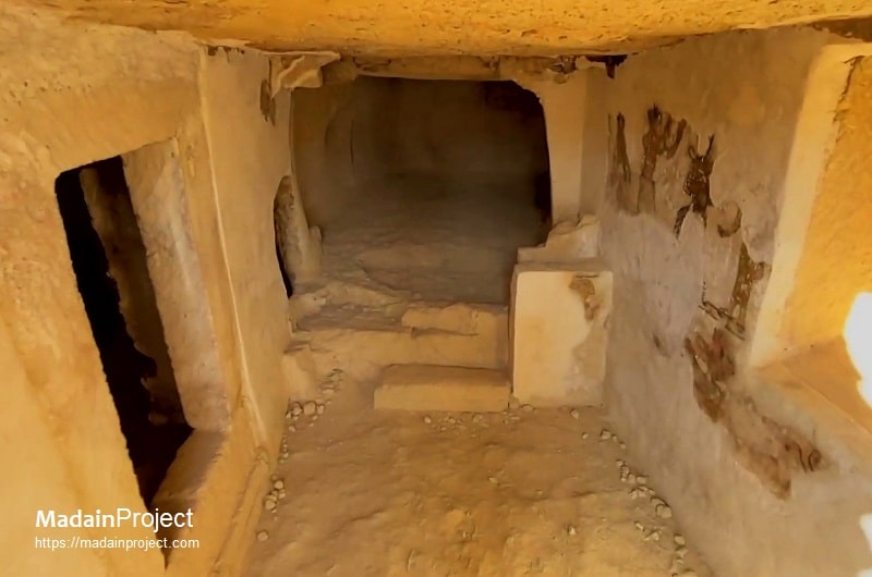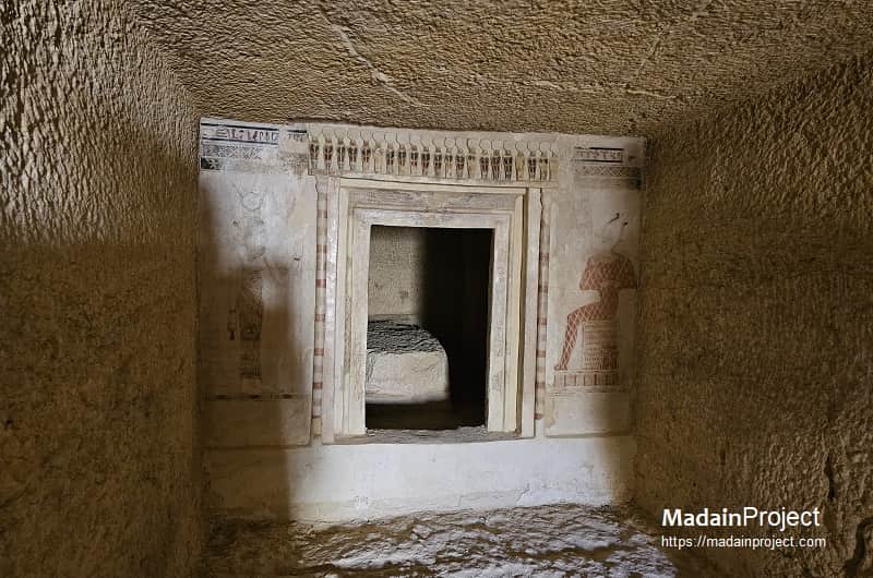 Burial architecture at Gebel el‑Mawta typically consists of rock-cut plans carved into terraces on the hillside. Many tombs follow a three-part layout: an entrance, a long or broad hall, and an inner burial chamber, with loculi (side‑niches) carved into the walls of the hall for secondary burials. In the more ornate tombs, such as that of Si‑Amun, loculi added during the Roman period indicate that family reuse of the tombs became common, with multiple mummies found in these recesses.