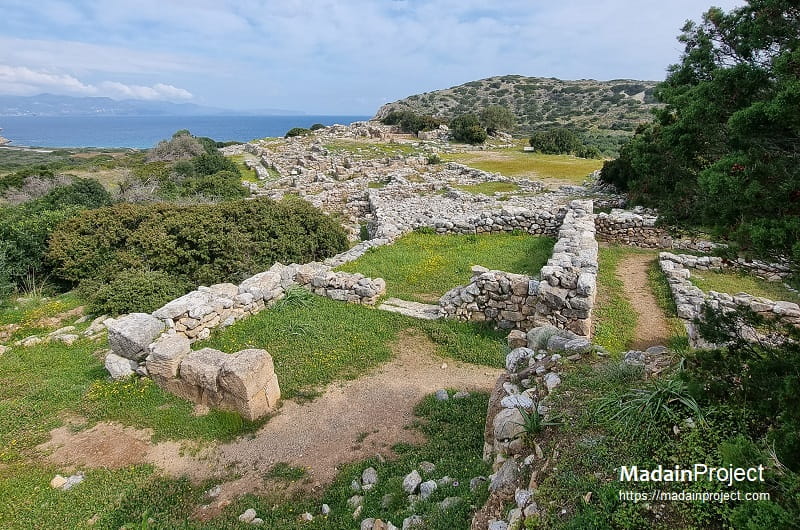 Archaeologically, the site consists of a densely built town organized around a small central court and connected by a network of narrow, stone-paved streets and stepped alleys. The settlement includes domestic houses, workshops, storage areas, and a modest “palace” or administrative complex, indicating a locally organized political and economic center integrated within the broader Minoan cultural sphere dominated by larger palatial sites such as ancient Knossos and ancient Phaistos. Material remains—such as pottery, tools, and industrial installations—suggest that the inhabitants were engaged in craft production, trade, and maritime activity connected to regional networks across the Aegean Sea.