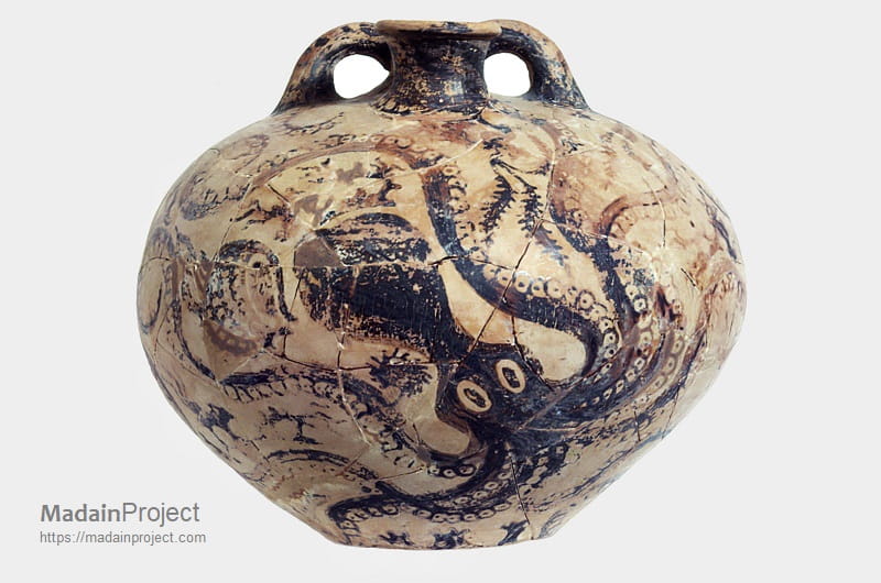 The Octopus Stirrup Jar from Gournia, now preserved in the Heraklion Archaeological Museum, is a Late Bronze Age Minoan ceramic vessel (Late Minoan III, circa 14th–13th century BCE) characteristic of the stirrup-jar type used for storing and transporting liquids such as oil. The jar has a globular body with a flat base and a shoulder supporting two vertical loop handles attached to a false spout, while the true pouring spout emerges between them—an arrangement typical of this functional form. Made of fine buff clay and decorated in dark brown to black slip, the vessel is covered with a naturalistic marine-style composition dominated by a large octopus whose rounded head occupies the central field while elongated tentacles, marked by rows of circular suction cups, extend fluidly across the curved surface.