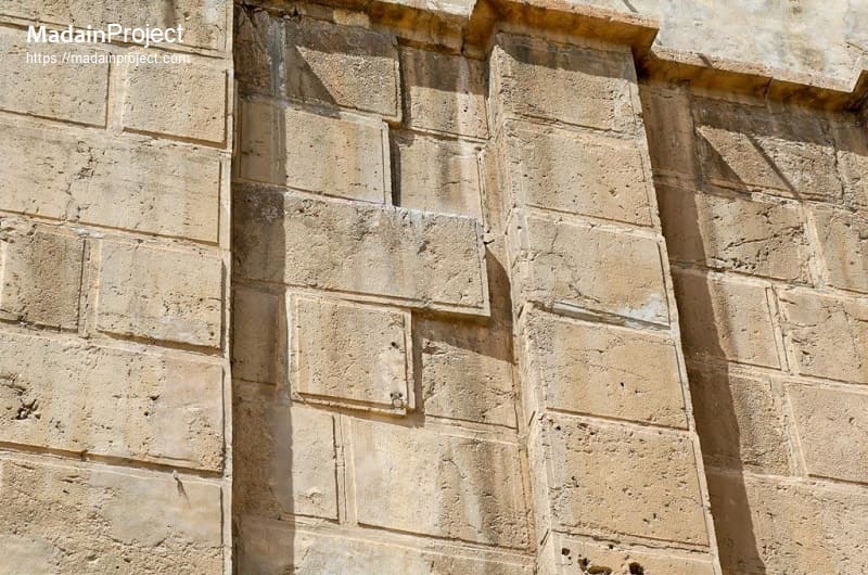 Herodian ashlar is defined foremost by its precise surface treatment. Each stone block is cut from local meleke limestone, a durable and fine-grained material that allows for sharp edges and controlled carving. The most distinctive feature is the drafted margin: a narrow, recessed frame carefully chiseled around the perimeter of the block’s exposed face. This margin encloses a slightly projecting central boss that is typically left smooth or minimally dressed, creating a subtle play of light and shadow across the wall surface. The depth and width of the drafted margin are consistent within individual structures, indicating standardized workmanship rather than ad hoc stone dressing.