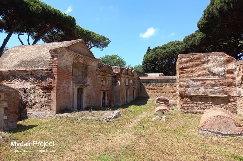 The necropolis occupies a strip of land on the Isola Sacra, a man-made island formed by the construction of the Fossa Traiana canal under the emperor Trajan. Lying outside the inhabited zones, in accordance with Roman law prohibiting burials within city boundaries, it developed along the road connecting Ostia with Portus Romae.