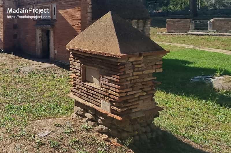 Beyond the standard chamber tombs, the necropolis also contains a range of secondary and simpler burial forms that reflect internal social differentiation within the port community. These include tombe a cassone, large chest-like masonry tombs, and tombe alla cappuccina, in which the body was covered by pitched terracotta tiles. In particularly crowded zones, such as the so-called “Field of the Poor”, burials were minimally marked, sometimes only by upright amphorae inserted into the ground. This architectural diversity is further enriched by ritual installations associated with funerary practice, including biclinia for banqueting, wells for purification rites, and ovens used in the preparation of ceremonial meals. Together, these features underscore the role of the tomb not merely as a burial container, but as a durable architectural setting for the continued social identity and ritual commemoration of the deceased.