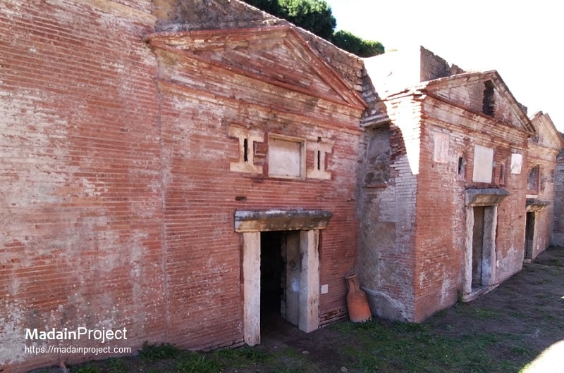 Among the most notable mausolea-structures are the "Tombe a Cella", or monumental chamber tombs, which often featured brick façades adorned with pilasters, triangular gables, and detailed terracotta reliefs depicting the professions of the deceased. These reliefs serve as vital socio-historical documents; for instance, Tomb 100 is renowned for its depictions of Scribonia Attice, a midwife, and her husband Marcus Ulpius Amerimnus, a surgeon shown performing a leg operation. Similarly, Tomb 78 contains a relief of a miller with a horse-driven millstone, illustrating the manual labor that sustained the port's economy.