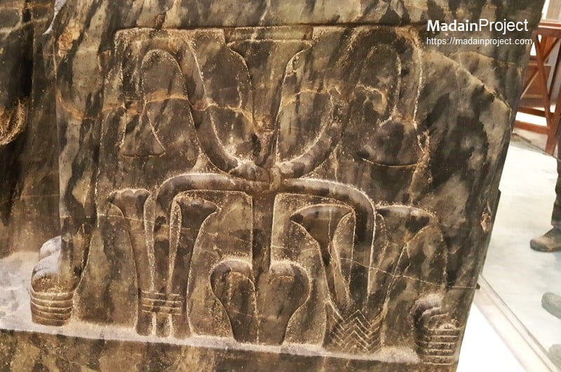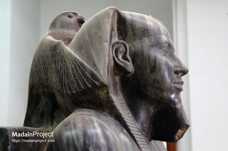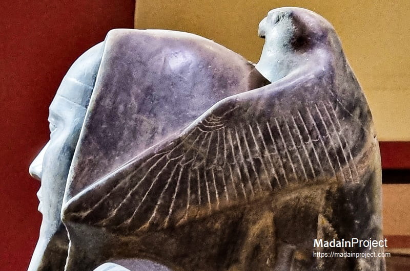Behind the king’s head appears the falcon god Horus (inspect), carved in high relief with wings outstretched around the back of the headdress. Although not visible from a frontal view, the bird’s presence signifies divine protection and affirms the identification of the living king with Horus. Beneath the king’s feet lies a flat base engraved with the motif of the “Nine Bows”, a traditional representation of Egypt’s enemies, symbolizing royal dominance over foreign and domestic adversaries.