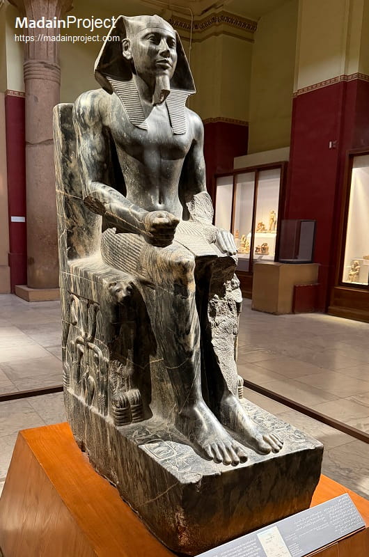 The composition emphasizes compactness and permanence. The king’s body is closely integrated with the throne block, with minimal projecting elements, creating a unified mass of stone intended to endure indefinitely. The statue is bilaterally symmetrical along a central vertical axis, suppressing movement and temporal change in favor of stillness and order. Only the subtle difference of the clenched right fist interrupts the otherwise perfect symmetry. The polished surface of the dark stone further enhances the impression of solidity and eternal presence. The completed sculpture stands approximately 1.68 meters (five feet six inches) in height, embodying the Old Kingdom ideal of a royal image designed to exist perpetually both in the earthly temple and in the realm of the afterlife.