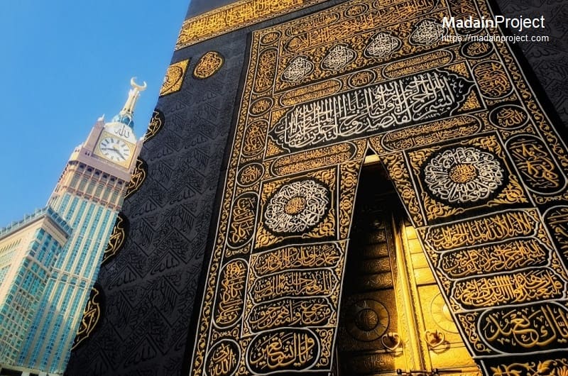 A decisive transformation occurred under the Umayyad caliph Muʿawiya ibn Abi Sufyan, who is credited with instituting a regular replacement schedule and commissioning fine textiles from state resources. The Abbasid period introduced the now-familiar black silk covering, replacing earlier white and colored fabrics, and established inscriptions as a defining feature. Control over Kiswa production later shifted to Egypt under the Fatimids and subsequently continued under the Mamluks, who founded the Dar al-Kiswah in historic city of Cairo (Fustat) and organized an annual ceremonial caravan accompanying the Kiswa to Mecca. This tradition continued under Ottoman rule, with the Kiswa dispatched from Cairo alongside the mahmal, a symbolic palanquin representing imperial patronage. Following the incorporation of the Hijaz into the Saudi state, King Abdulaziz ordered the establishment of a local production facility in Mecca in 1927 CE, ending external manufacture and situating the entire process within the sanctuary’s immediate geographic context.