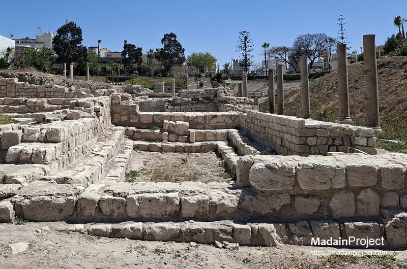 A unique group of 22 lecture halls from the 5th through 7th centuries CE stretches along g monumental, colonnaded portico traversing the site from north to south. The auditoria that have been excavated so far are all of different size, yet they share a similar orientation and layout. Most are rectangular, although in a few cases one long end took on the form of a semicircular exedra. Stone benches are the most important interior furnishing. They are present in all of the halls, lining the walls in two or three rows. Tiered seats could hold from 20 to 30 students, sitting on alternate steps.