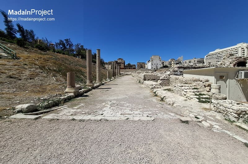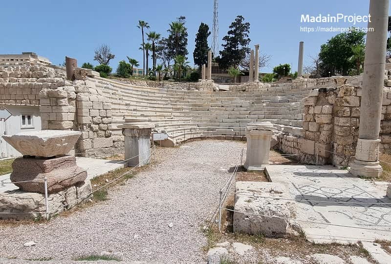 The Roman Theater (المسرح الروماني) at Kom el-Dikka is the only known Roman-period structure of its type preserved from ancient Egypt. Originally constructed in the 4th century CE, it continued in use for nearly three centuries, falling into ruin only after the end of antique Alexandria. Its initial design comprised a semicircular audience space, intended as a small theatre or odeum for musical performances and possibly oratory. The seating consists of thirteen terraces, the first row carved from red Aswan granite, while the remaining seats employ white and grey marble, some bearing Roman numeral inscriptions. Certain blocks were salvaged from an earlier, larger architectural structure, including examples of seats made from finely carved cornices, displayed at the top of the auditorium.
