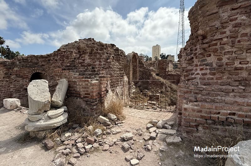 North of the theatre stands the extensive public bath complex, constructed in the 4th century CE and rebuilt following earthquake damage in 447 CE and again in 535 CE. The installation follows the canonical layout of Roman thermae, including a changing room, cold, warm, and hot rooms, steam chambers, a destrictarium, a large pool, and service areas such as storerooms and furnace rooms. A notable feature is the above-ground cistern that supplied the complex, a comparatively unusual solution within Alexandria.