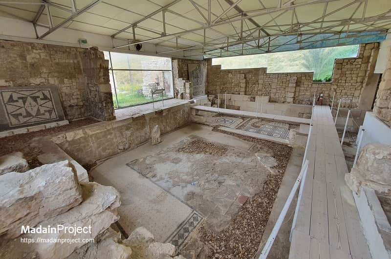 The villa was destroyed by fire in the late third century CE, yet many mosaics survived. Between approximately CE 450 and 550, Byzantine-period houses, storerooms, and workshops were constructed atop the ruins. Remnants of walls from these later structures remain visible above the Roman courtyard.