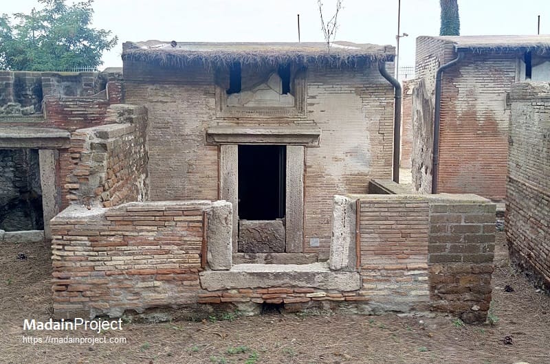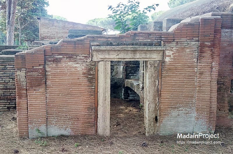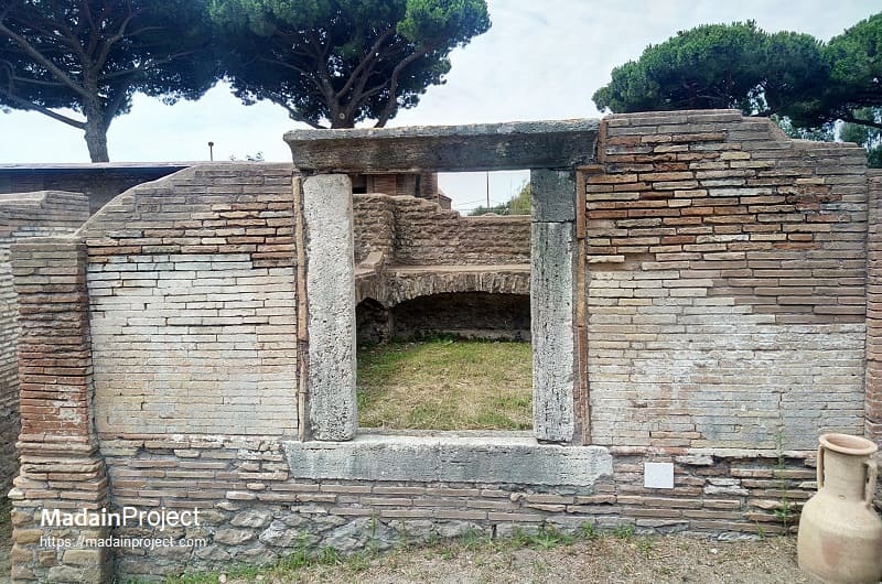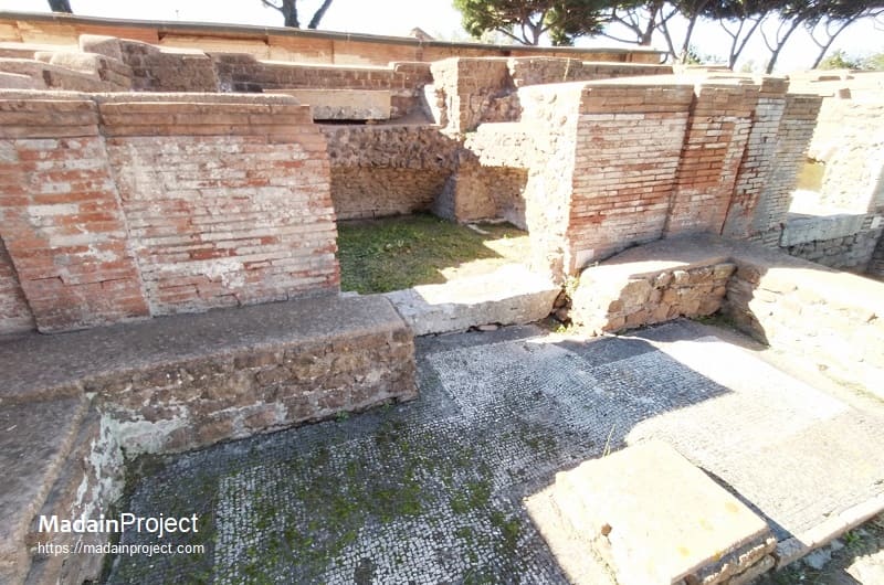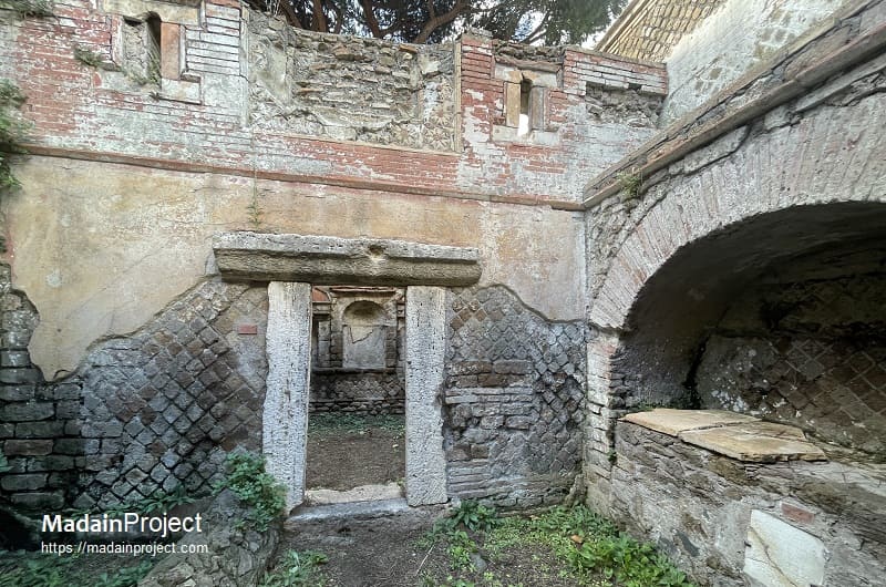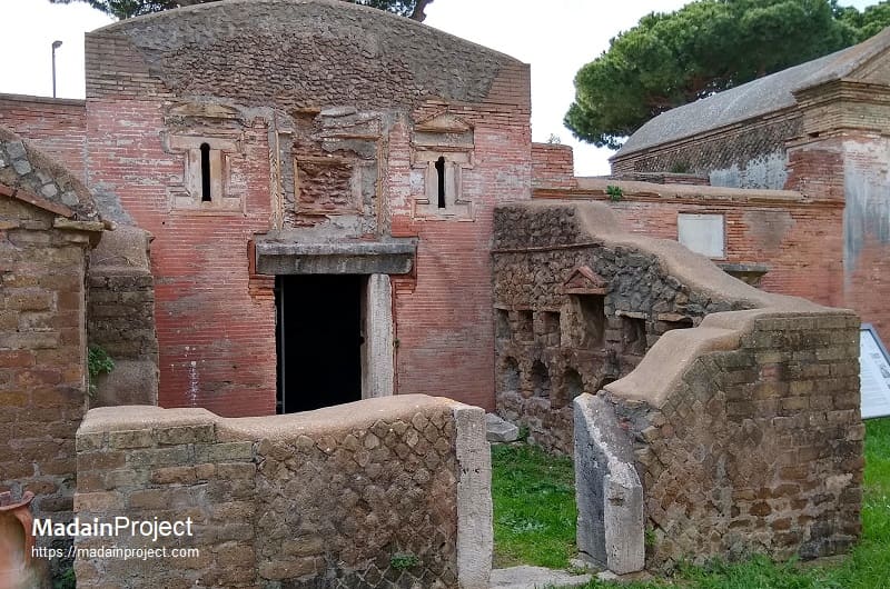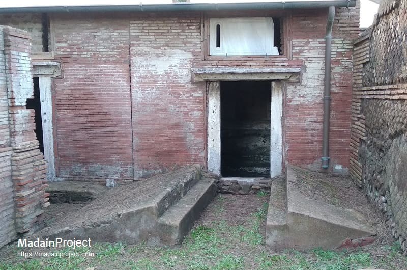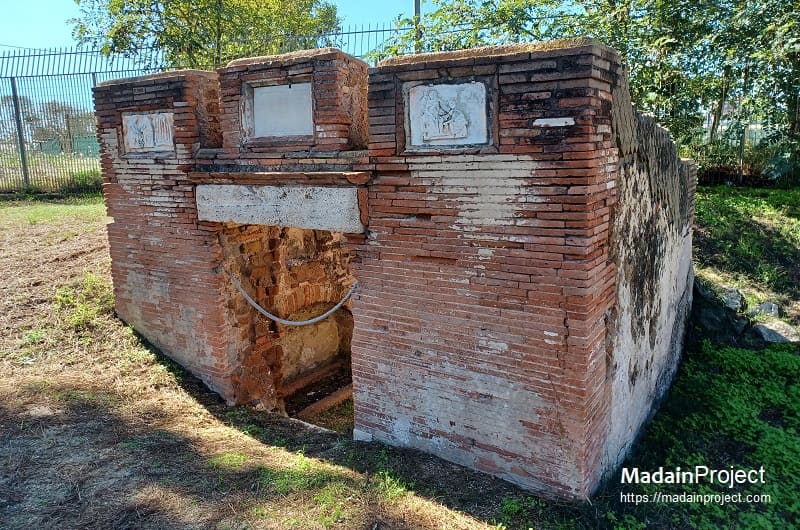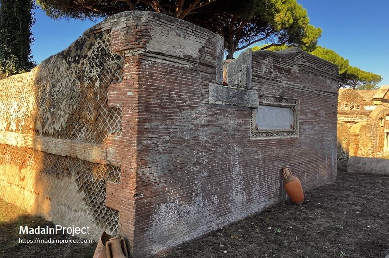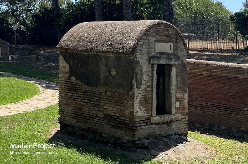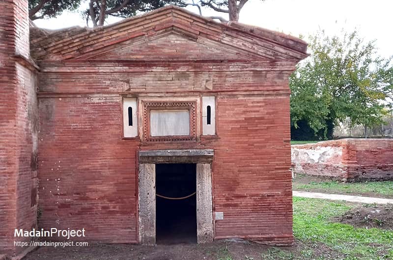The sarcophagus placed against the rear wall, the only one still preserved in situ, is decorated on its front with strigiles, the characteristic undulating grooves of Roman funerary art. Inside this sarcophagus two skeletons were found, along with a small ring, a gold necklace, and a coin that has not yet been conclusively identified. The tomb itself dates back to the Hadrianic period. Its interior walls were originally divided by a simple moulding into a lower zone with arcosolia and an upper zone with elaborately decorated niches intended for urns. Beneath the black-and-white mosaic floor, two formae were discovered, separated by tuff walls and sealed with tiles, attesting to the continued use of cremation in the earliest phase. In the middle of the second century CE, the tomb was extensively rebuilt to accommodate inhumation. The three sarcophagi described above, dating to approximately 180–190 CE, bear witness to this transformation; two of them are now housed in the Ostia Museum. The construction of the enclosing courtyard also belongs to this later phase.