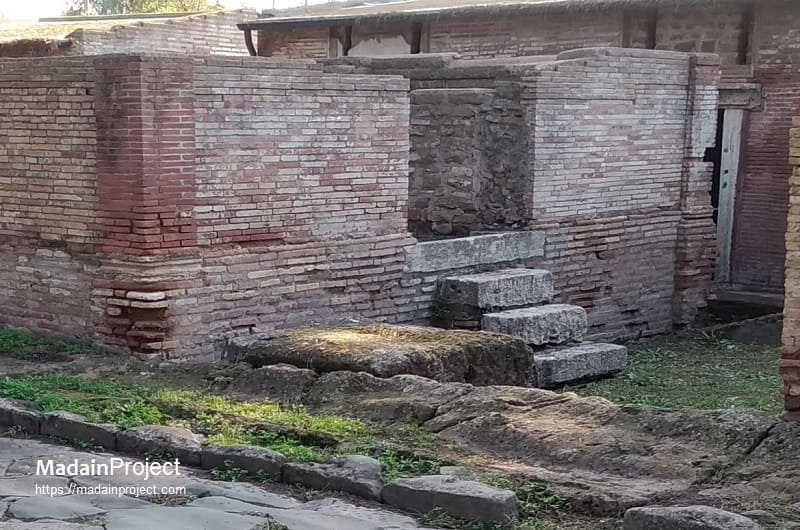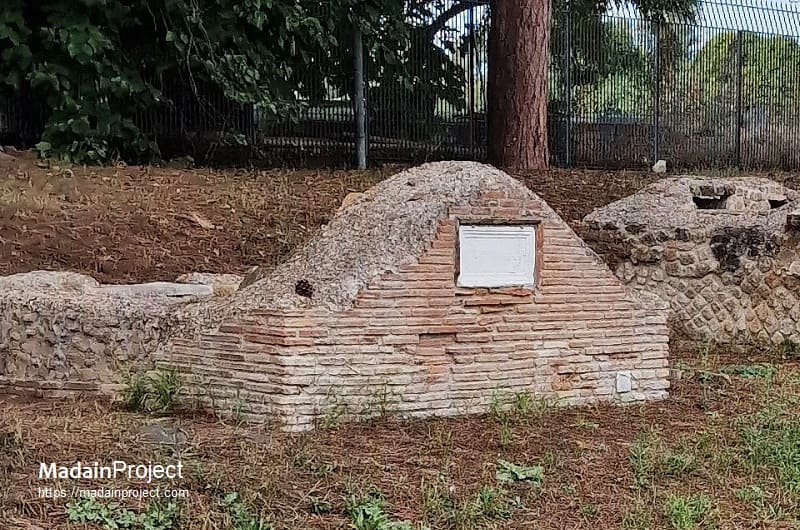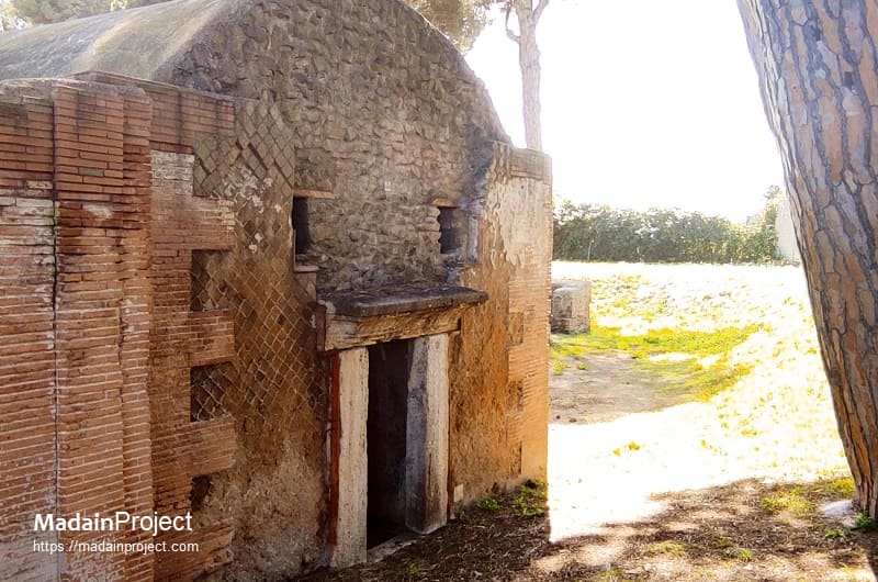 Tomb 1 is situated immediately upon entering the excavation area from the south, where the visitor steps onto the remains of the former main thoroughfare, the Via Severiana. This road constituted a significant artery of movement and communication in the Roman period, and, in accordance with Roman funerary custom, was flanked by burial monuments situated outside the inhabited zone. On the left side of the road stands Tomb 1, a detached funerary monument occupying an open space between the Via Severiana and the adjacent tombs conventionally numbered 2, 3, and 4.