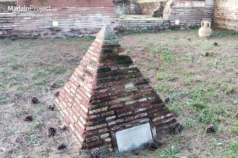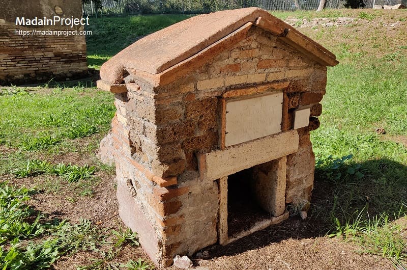In front of the tomb, a brick or stone base for a funerary table is preserved, indicating that ritual meals or offerings were performed in association with the grave, consistent with the a cassone typology, which typically accommodated both commemorative display and small-scale funerary rites.