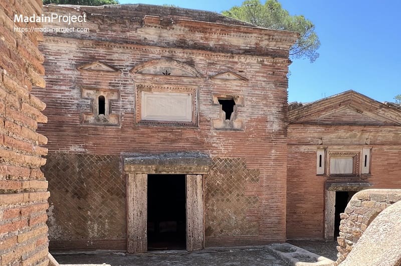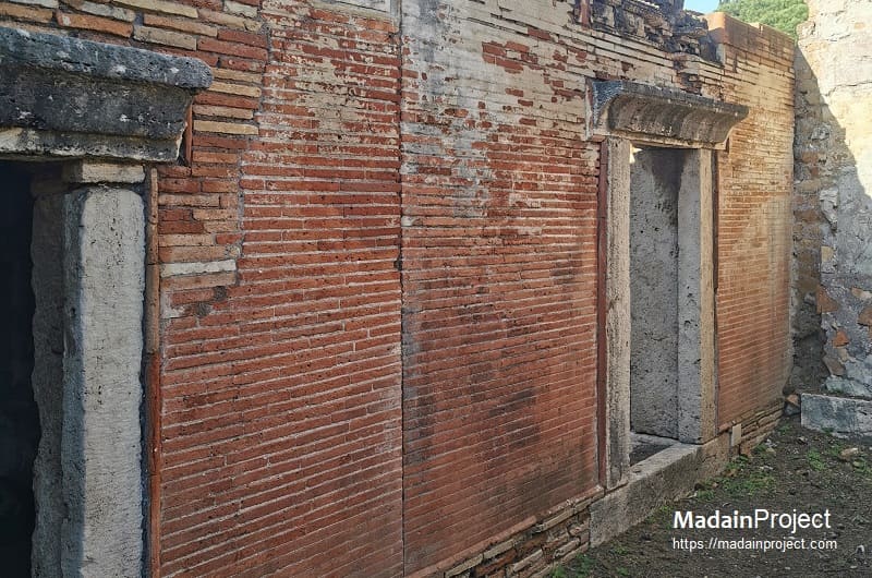 Originally, Tomb 16 consisted solely of a burial chamber oriented toward the Via Severiana, although it was set back at a slight distance from the roadway rather than opening directly onto it. On its left side the monument was likewise detached, and an alley separated it from Tomb 15. This spatial configuration indicates that, at the time of its initial construction, Tomb 16 stood as an independent structure within a relatively open funerary landscape. In a subsequent phase, a courtyard was added, enclosing both the area between Tomb 16 and the Via Severiana and the former alleyway. The entrance to this enclosure was oriented toward the north rather than toward the main road, marking a significant reorganization of access and movement. Part of the enclosure was covered by a roof supported by brick columns, one of which remains standing today in the center of the courtyard and provides valuable evidence for the original architectural articulation of this space.