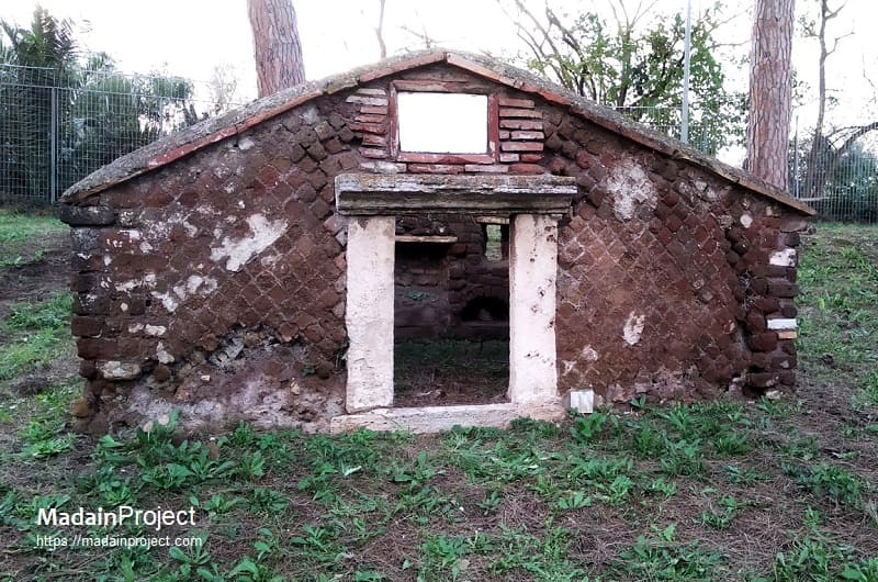 The enclosure was likely constructed around 150 CE and was used exclusively for the interment of urns. Its design includes four columbaria connected by a corridor leading to the street. Above the entrance, a marble slab measuring 35 × 78 cm once bore an inscription flanked by reliefs, which are now lost: