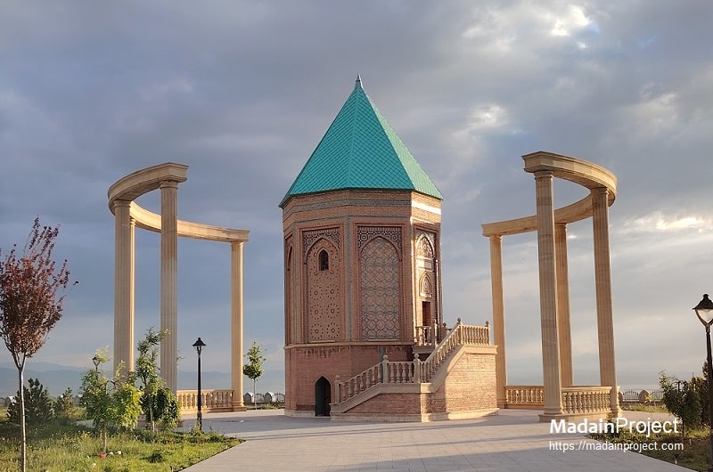 The restored mausoleum stands approximately 15.50 metres in height and measures roughly 7.50 metres in width, comprising the lower crypt, elevated mausoleum body, and superstructure roof. Construction materials include brick and stone consistent with regional building practices, and ornamentation is restrained, emphasizing geometric and structural clarity over figural decoration. Internally, the burial vault is reached via a ladder and is defined by the central column — the symbolic locus of Noah’s tomb — rather than by elaborate epigraphic or decorative programmes.