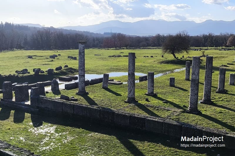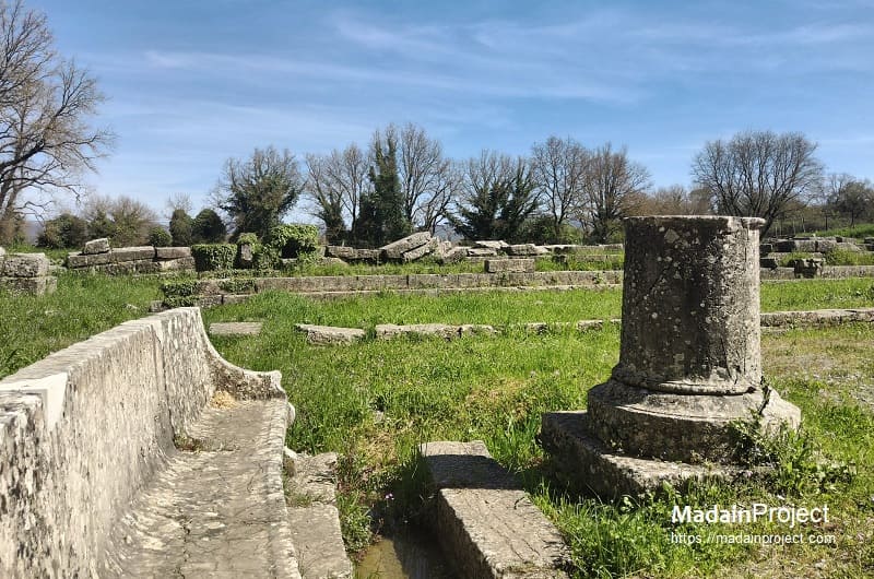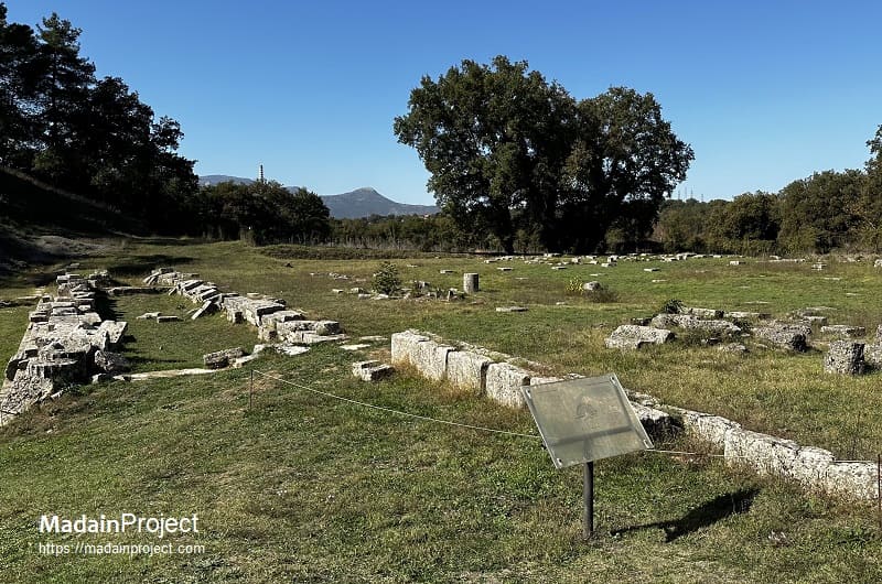 The agora of Megalopolis was among the largest in ancient Greece and was bounded on multiple sides by monumental stoai. The northern Stoa Philippeios, measuring approximately 156 meters in length, was constructed to honor Philip II of Macedon, while the eastern Stoa Myropolis extended roughly 125 meters. On the western side of the agora stood a complex containing the bouleuterion and prytaneion, built over the remains of an earlier city palace, along with a sanctuary dedicated to Zeus and Hestia. Sparse remains near the northwestern edge of the agora have been interpreted as a possible meeting place of the ecclesia, while at the northeastern edge stood the Archeia, a hall that housed statues. Together, these remains reflect the city’s original conception as a monumental federal capital, designed to embody Arcadian political unity and collective identity.