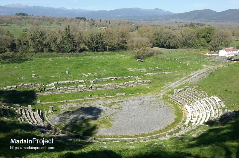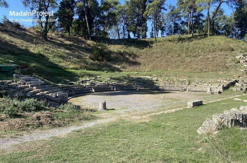The theater of Megalopolis was among the largest in the Greek world and symbolized the city’s federal character. Constructed in the late fourth century BCE, it was designed not only for dramatic performances but also for large political gatherings. Adjacent to the theater stood the Thersilion, a monumental assembly building used by the Arcadian League, allowing theatrical space and political deliberation to function as a single civic complex. The scale of the cavea and orchestra reflects the intention to accommodate thousands of citizens and delegates, underscoring Megalopolis’s role as a meeting place for the Arcadian population as a whole.