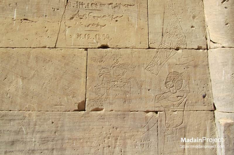 On the façade of the Temple of Kalabsha, there exists a striking figural graffito depicting the mid-fifth century CE King Silko of Nobatia. The image shows Silko in the act of spearing an enemy while on horseback, a visual assertion of his martial authority and dominance. Above him, a celestial figure—interpreted as an angelic or divine intermediary—appears to place a crown upon his head, symbolizing the king’s divine endorsement and legitimization. Nearby, later inscriptions and graffiti from the nineteenth century attest to continued human interaction with the site over centuries. The graffito thus combines political, religious, and artistic elements, offering a vivid visual record of Nubian royal ideology and the ways in which rulers sought to present themselves under the gaze of both mortal and divine audiences.