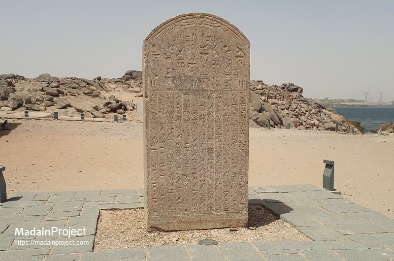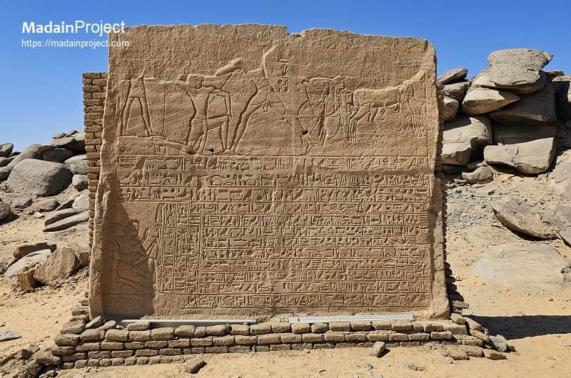 The Victory Stela of Seti I, now displayed at New Kalabsha, originated from Qasr Ibrim and records the campaigns of the Nineteenth-Dynasty ruler in Nubia. It commemorates his military expeditions to reassert Egyptian control in the region and celebrates his victories over the local tribes of Wawat and Kush. The stela is executed in fine raised relief, with the pharaoh shown smiting captives beneath the protection of Amun-Re, embodying the ideology of divine kingship and military legitimacy that characterized early Ramesside policy in Nubia. Its relocation to New Kalabsha preserved one of the few large-scale inscribed royal monuments linking the early Ramesside presence directly to this southern frontier, bridging the iconographic and political themes found also in nearby Beit el-Wali.