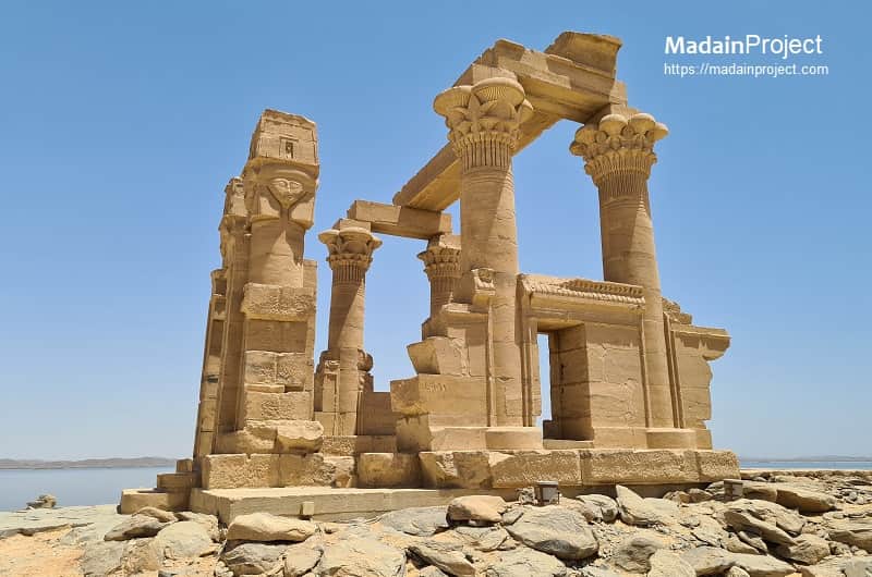 The Kiosk of Qertassi is a small Roman structure originally located near the sandstone quarries of Qertassi, about 30 kilometers south of Aswan. The kiosk is characterized by its four slender papyrus columns inside and two Hathor-headed columns at the entrance. It is believed to have been dedicated to the goddess Isis as well. The kiosk's architectural style suggests it was constructed during the reign of Roman emperor Augustus or possibly a bit earlier. Its relocation to New Kalabsha open air museum preserved this elegant structure, which now stands as a testament to Roman architectural influence in Nubia.