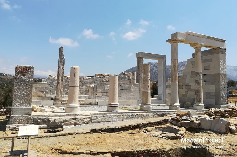 The temple of Apollo, situated on the islet of Palatia at the northern periphery of Naxos harbor, serves as a paramount exemplar of the ambitious monumentalization characteristic of the Archaic period under the tyranny of Lygdamis (circa 530 BCE). Although construction ceased abruptly following the tyrant's deposition in 524 BCE, the extant foundations and the iconic Portara—an 80-ton marble gate—reveal an intended design of a colossal Ionic peripteral temple of the hexastyle-distyle type, measuring approximately 59 by 28 metres.
