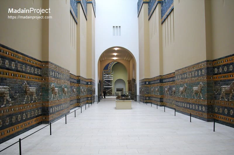 The Ishtar Gate was an ancient Babylonian monument that, originally built in the city of Babylon, which is located in present-day Iraq. The gate along with the processional street of Babylon (inspect) or the ritual path was constructed in the 6th century BCE by King Nebuchadnezzar II and served as the main entrance to the city's inner complex. In the early twentieth century CE, a team of German archaeologists led by Robert Koldewey excavated the site of the Ishtar Gate and transported its remains to Berlin, where it was reconstructed in the Pergamon Museum. The reconstruction of the Ishtar Gate in the Pergamon Museum is an impressive and faithful recreation of the original monument. The gate is approximately 14 meters high, 30 meters long, and 5 meters deep, and is made up of over 8,000 individual bricks. Another point of note is that the current exhibited gate is merely a part of a much larger gate complex.