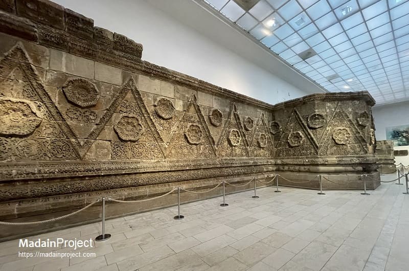 A notable distinction exists between the two sides of the central entrance portal: the left side incorporates a variety of figurative elements, including peacocks, griffins, and lions drinking peacefully from ornate bowls, while the right side displays only non-figurative, vegetal designs. This figural asymmetry is widely interpreted by scholars as a visual demarcation between the caliph's secular residential wing and the palace's mosque, which lay behind the non-figural section. The decoration synthesizes influences from Late Antique, Byzantine, and Sasanian artistic traditions, reflecting the multicultural workforce and imperial ambitions of the Umayyads.