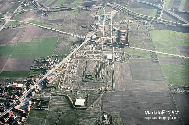The plan belongs to the first half of the fourth century BCE and closely approximates the ideal Hippodamian model, though it is distinguished by the unusually large size of its insulae; by comparison, the blocks at Olynthus in Chalcidice measured 86.3 × 35 meters. Conversely, later Hellenistic urban foundations exhibit block dimensions comparable to those of Pella, such as the 112 × 58 meters blocks of Laodicea ad Mare and the 120 × 46 meters blocks of Aleppo.