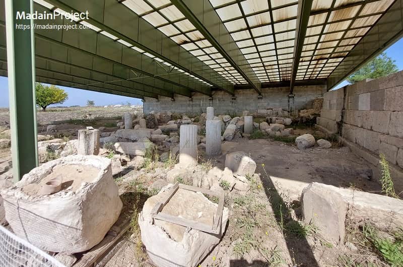 The temple complex dedicated to Mother of the Gods and Aphrodite, which was worshiped as the protector goddesses of the city and the public life, occupied the entire width of the block north of the Agora. The temple stood from the last quarter of the fourth century BCE to the early first century BCE. A small temple was located on the south side of the complex, in a large outdoor area flanked by porticos. In the north section of the complex, from an earlier constrcution phase, there was another cult area with an altar. Here the operating needs of the sanctuary were served in outdoor areas with wells and tanks, in a hall where meals were served, in storerooms and workshops. The identification of the cult was based on votive offerings bearing the figures of the two goddesses, as well as votive inscriptions, relief stelae of the Greek areas.
