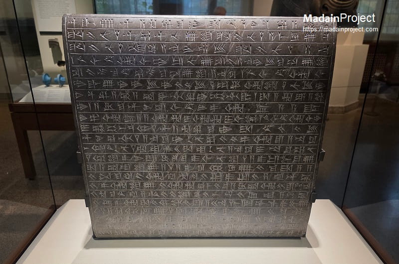 The seven slabs bear cuneiform inscriptions in Old Persian, Babylonian, and Elamite that record versions of two different texts. The Babylonian version inscribed on this slab gives the titles and attributes of Xerxes, lists subject lands that brought tribute, and tells how he suppressed disorder and the worship of "evil ones" (in the Old Persian counterpart, daiva or demons), restoring the proper worship of Ahuramazda.