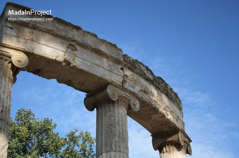 The architecture of the Philippeion is distinguished by a refined yet ideologically charged design that combines Macedonian royal self-representation with established Greek architectural forms. The building is a circular structure, or tholos, an uncommon choice within Greek sacred architecture and particularly striking in the largely rectilinear architectural landscape of the sanctuary of ancient Olympia. Measuring approximately 15.3 meters in diameter, it rests on a three-stepped marble stylobate that elevates the monument both physically and symbolically above its surroundings, underscoring its exceptional status among the sanctuary’s buildings.