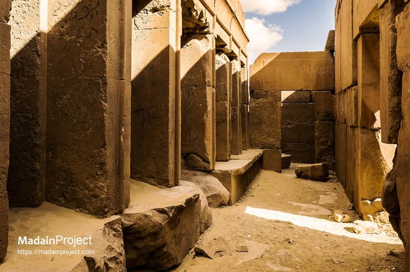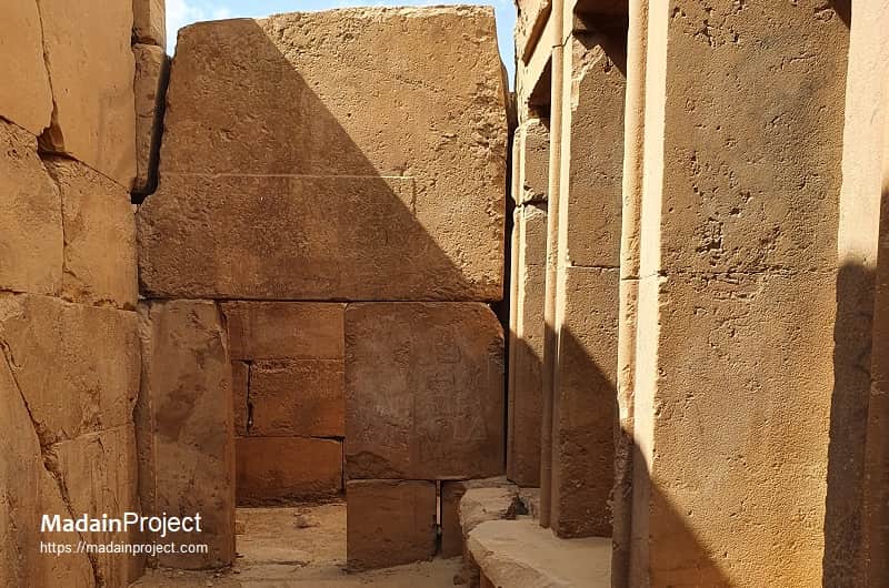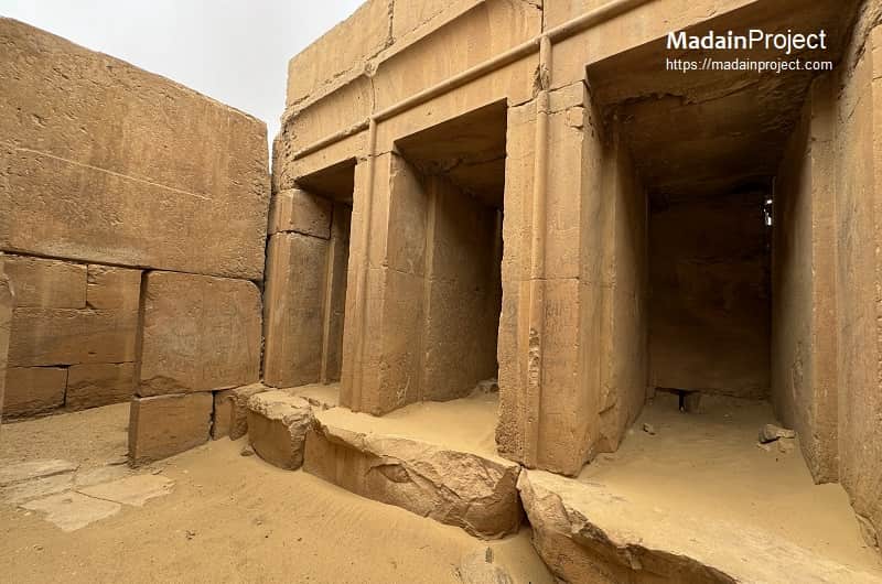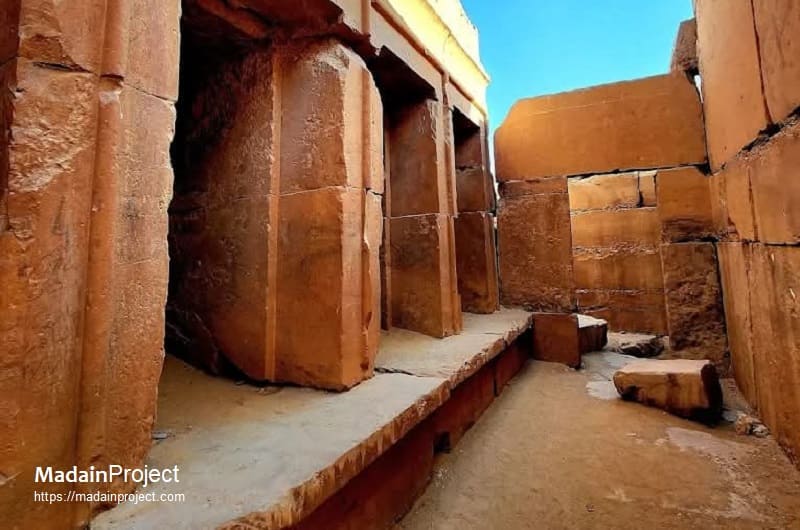 The Qasr el-Sagha temple is built entirely of massive sandstone blocks laid with exceptional precision but left unpolished. The masonry demonstrates a mastery of quarrying and alignment, with tight joints and level courses characteristic of Middle Kingdom engineering. The plan is compact and axial, comprising a rectangular mass approximately 14 metres in length, 12 metres in width, and rising to about 5 metres in height. Its interior consists of seven small chambers arranged symmetrically along a central corridor that terminates in a larger sanctuary-like space at the rear. The rooms communicate through narrow doorways roofed with monolithic lintels, while the outer walls are plain and unadorned.