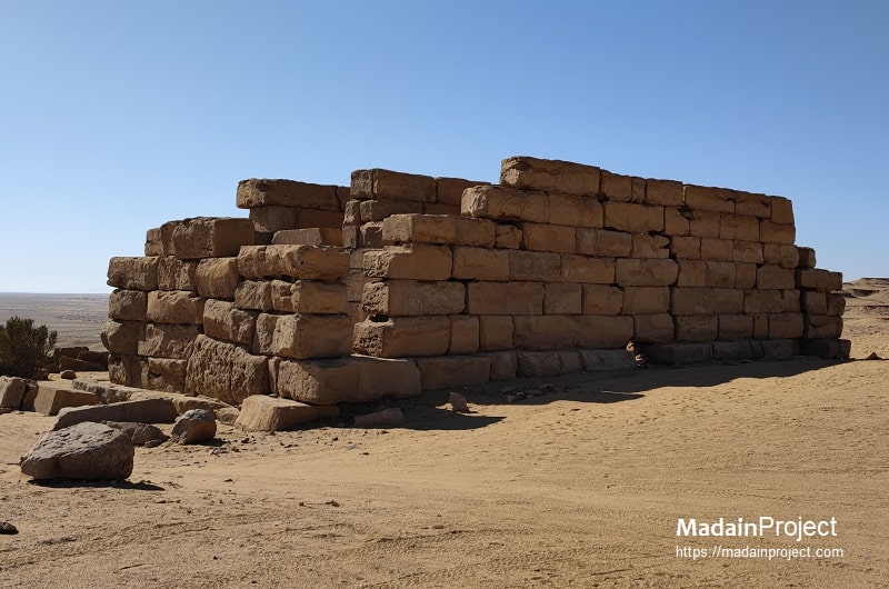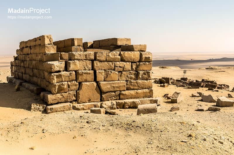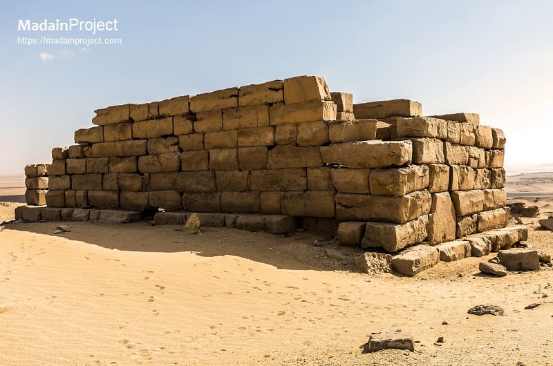 The temple of Qasr el-Sagha occupies a commanding position in the northern Faiyum Desert, approximately eight kilometres north of Lake Qarun and roughly fifty kilometres southwest of Cairo. The remains of the temple are located approx. 550 meters to the south-west of the so-called Qasr el-Sagha Formation plateau.
