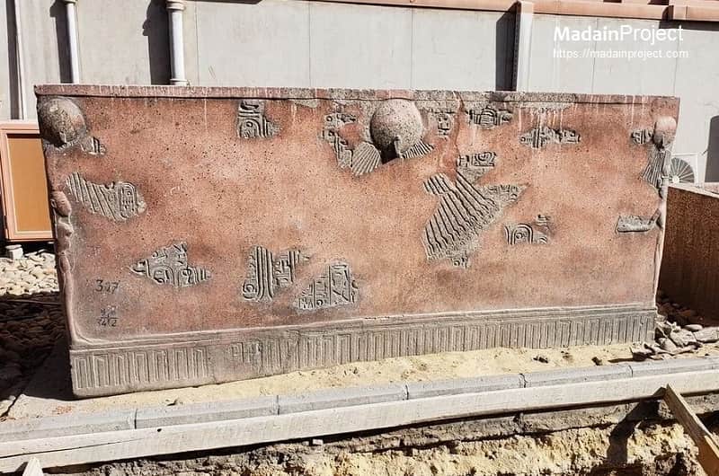 Fragments of granite sarcophagi and lids for Akhenaten and Meketaten have been recovered. Akhenaten’s sarcophagus has been reconstructed from many fragments; it is displayed in the Egyptian Museum in Cairo. It was made of red granite (from Aswan), and is rectangular (departing from the typical anthropoid (human-shaped) sarcophagus). Its decoration replaced protective deities in the corners with figures of Nefertiti; the lid’s sloping form recalls the shrine shape of Upper Egypt; rays of Aten extend along its length.